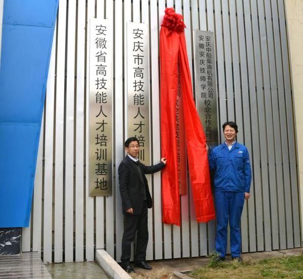 在中船柴油機(jī)有限公司調(diào)研時(shí),畢明生和公司總工程師張仕明共同為校企共建的技能大師工作室揭牌。