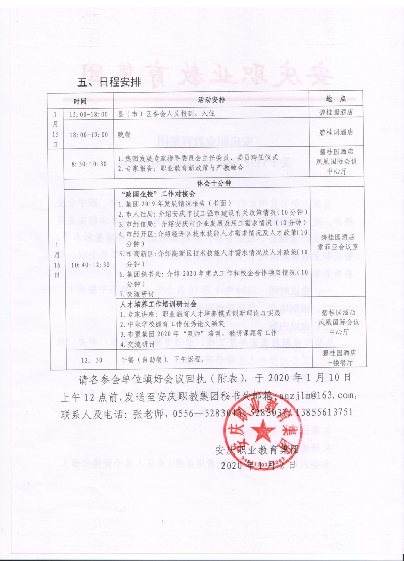 安慶職教集團(tuán)擬定于2020116日召開(kāi)集團(tuán)2020年工作會(huì)議,請(qǐng)各參會(huì)單位填好會(huì)議回執(zhí)(附表),于2020110日上午12點(diǎn)前,發(fā)送至安慶職教集團(tuán)秘書(shū)處郵箱:aqzjlm@163.com。參會(huì)回執(zhí)見(jiàn)附件2。