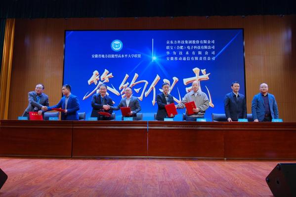 會議通過《安徽省地方技能型高水平大學聯盟章程》與《安徽省高等職業教育高質量發展宣言》;京東方、聯寶電子、華為、安徽移動與聯盟簽訂合作框架協議;舉行安徽省高職院校“雙基建設”公共信息平臺發布會。
