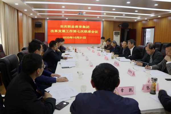 10月31日上午,安慶職教集團在安慶職業技術學院召開改革發展工作第七次聯席會議。集團理事長、安慶職業技術學院黨委書記王進主持會議。集團副理事長、市教體工委副書記陳亞玲,集團副理事長、安慶職業技術學院副院長李克讓,市人社局局長聶立新,市經信局局長楊旭東,市委督查考核辦副主任朱代全,市經開區管委會副主任汪建寧,市高新區管委會副主任官葉斌,安慶筑夢新區管委會金融發展部部長陳龍,安慶電大校長吳雪恩,安徽化工學校校長徐志,安慶工業學校副校長汪俊東,安徽理工學校副校長郭世杰等出席會議,集團專業建設部、職教集團秘書處相關負責同志參加會議。