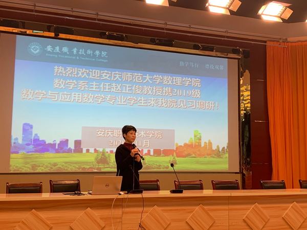 11月5日上午,安慶師范大學(xué)數(shù)理學(xué)院數(shù)學(xué)系2019級(jí)數(shù)學(xué)與應(yīng)用數(shù)學(xué)專業(yè)253名同學(xué)到安慶職業(yè)技術(shù)學(xué)院見習(xí)調(diào)研。安慶師范大學(xué)數(shù)理學(xué)院數(shù)學(xué)系主任趙正俊教授帶隊(duì)。安慶職業(yè)技術(shù)學(xué)院教務(wù)處、馬克思主義學(xué)院負(fù)責(zé)同志接待了師大師生。