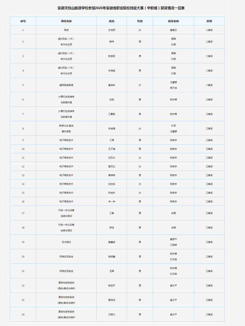 近日,2020年安徽省職業院校技能大賽(中職組)成績公布,安徽天柱山旅游學校再創佳績,榮獲3個二等獎,8個三等獎,共有24名學生獲獎。