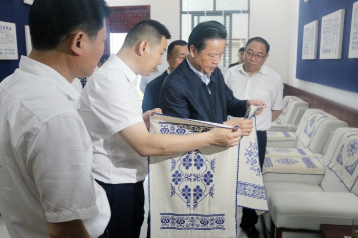 望江挑花至今已有1000多年歷史,2008年入選為國家非物質文化遺產名錄。多年來,安慶皖江中等專業學校在望江挑花的保護、傳承、研發方面做了大量工作。張昌爾一行實地參觀了望江挑花保護與傳承基地,聽取該校董事長吳燦及非遺傳承人介紹挑花工藝、制作流程,詳細了解挑花產業發展情況。張昌爾指出,望江挑花作為國家非物質文化遺產,做工精細、產品精美,是望江重要的文化資源。要積極做好傳承工作,充分挖掘文化內涵,不斷創新載體,加強人才培養,讓挑花工藝發揚光大,助力鄉村振興。要利用國家非物質文化遺產這一品牌,積極搭建平臺,開展招商引資、招賢引智,賦能挑花產業高質量發展。