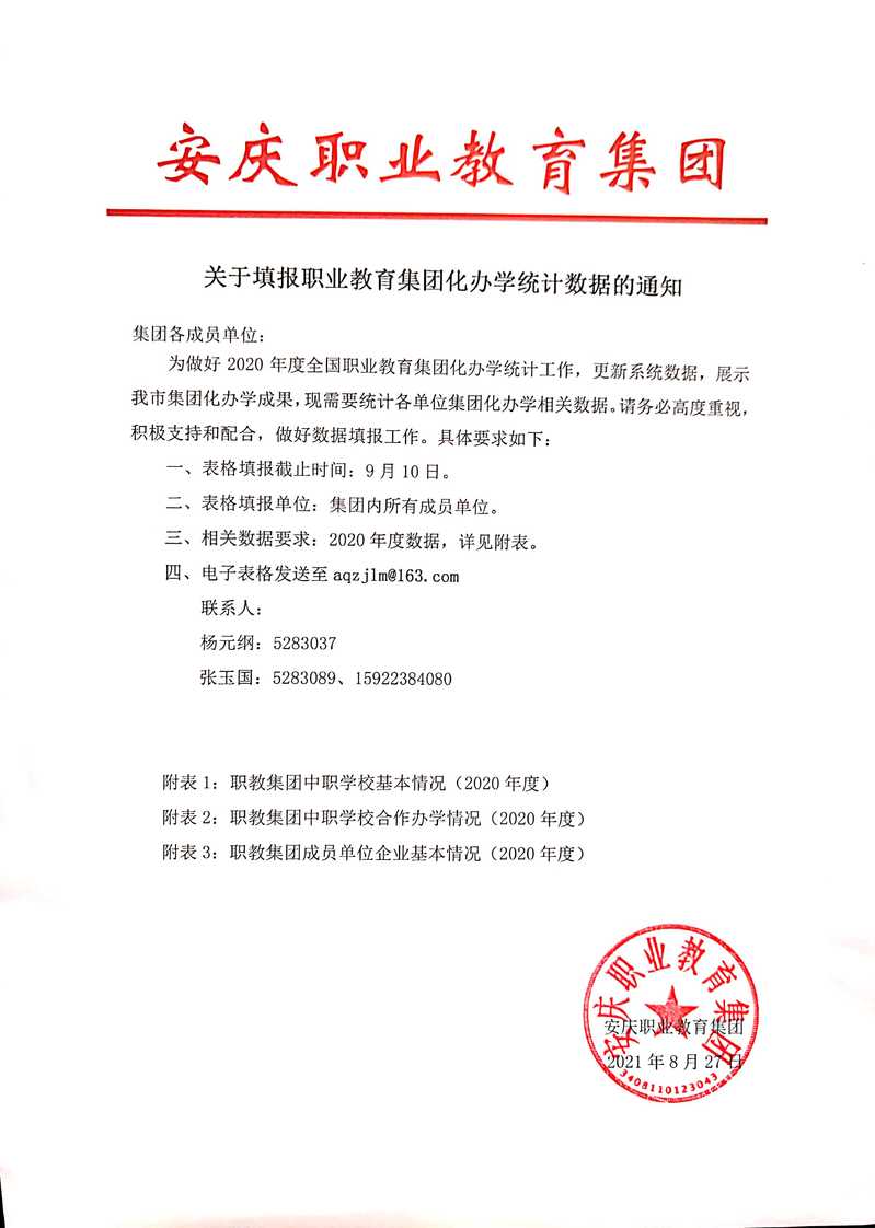 為做好2020年度全國職業教育集團化辦學統計工作,更新系統數據,展示我市集團化辦學成果,現需要統計各單位集團化辦學相關數據。請務必高度重視,積極支持和配合,做好數據填報工作。
