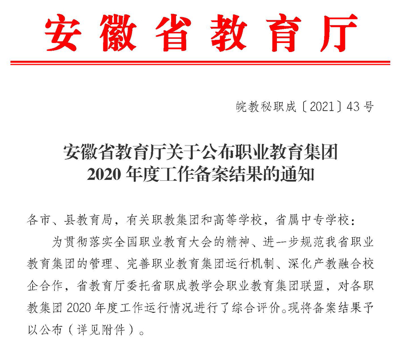 9月8日 ,安徽省教育廳公布了全省47個(gè)職業(yè)教育集團(tuán)2020年度工作備案的結(jié)果,安慶職業(yè)教育集團(tuán)再度獲得A等級(jí)。