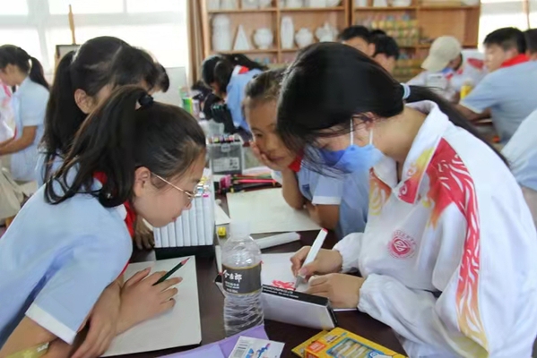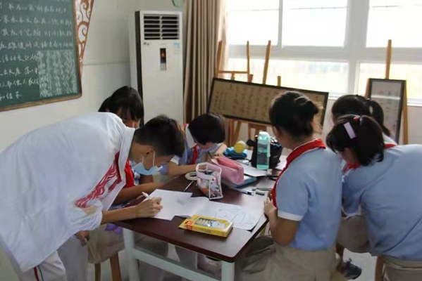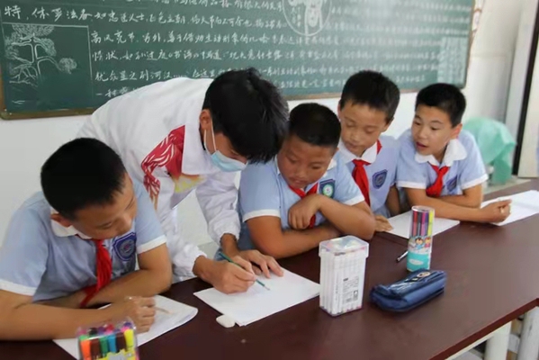項目組一行在老峰鎮中心學校召開座談會,儲可可介紹了項目組成員、項目開展情況以及此次活動的方案、預期要達到的效果等。老峰鎮中心學校沈良順校長簡要介紹了老峰鎮中心學校校史、美術體育課程開設情況等。隨后,安慶職業技術學院藝術俱樂部部分優秀學生深入課堂,給五、六年級學生開展繪畫、藝術體操等教學活動。
