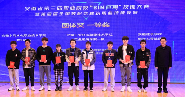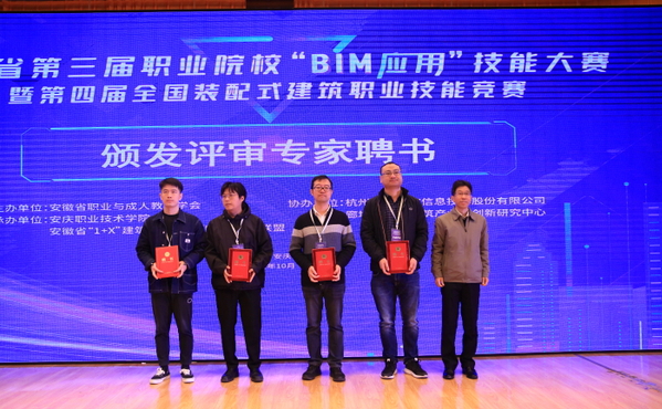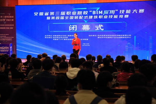 10月17日,安徽省第三屆職業(yè)院校“BIM應用”技能大賽暨第四屆全國裝配式建筑職業(yè)技能競賽建筑信息模型技術員(學生組)選拔賽完成全部比賽任務,圓滿落幕(BIM全稱Building Information Modeling,即建筑信息模型)。安慶市副市長楊林,省教育廳高教處主任任雯君,安慶職業(yè)技術學院黨委書記童宏葵、校長畢明生等領導出席閉幕式,為獲獎選手和團體頒獎,與大賽評審專家合影留念。安徽省BIM工程中心副主任、安徽建筑大學土木工程系主任陳東對大賽進行總結點評。中國建設教育協(xié)會教育技術專業(yè)委員會秘書長、廊坊市中科建筑產(chǎn)業(yè)化創(chuàng)新研究中心副主任張建奇,安徽省“1+X”BIM 證書聯(lián)盟秘書長、安慶職院副校長譚維奇分別講話。安慶職院酒店管理專業(yè)教師沈娟娟主持儀式。