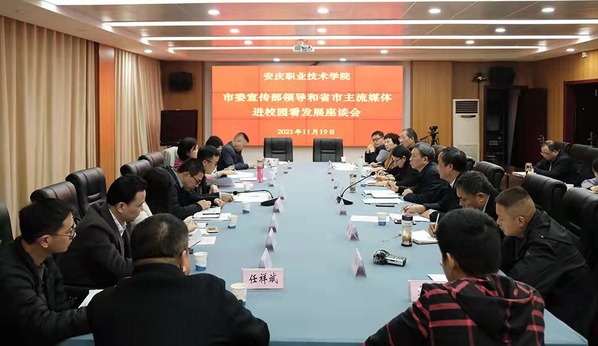 11月19日下午,安慶市市委宣傳部副部長查文平,市融媒體中心黨委委員、副主任陳慶玲以及安徽日報、安徽廣播電視臺、安徽經濟報、安徽法制報、市場星報、安徽商報、皖江晚報、中安在線安慶頻道等省市9家主流媒體和中國網,走進安慶職業技術學院校園看發展,并進行座談。校黨委書記童宏葵出席座談會并作了熱情洋溢的講話,對學校與媒體進一步加強溝通交流提出要求。校黨委委員、宣傳部長潘發生主持座談會。