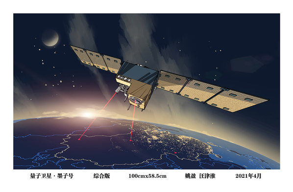 《量子衛星·墨子號》記錄了2016年8月16日成功發射的“墨子號”量子科學實驗衛星畫面。“墨子號”使我國在世界上首次實現衛星和地面之間的量子通信,構建天地一體化的量子保密通信與科學實驗體系,此前從未在媒體上刊登任何完整的圖片。為了在作品中能真實展現出“墨子號”的精彩畫面,作者歷時四個多月時間,花費大量精力查閱收集資料素材,手繪修改數十稿,最終以綜合版畫的形式將量子衛星“墨子號”與地面站建立天地鏈路的場景展現于觀眾面前。