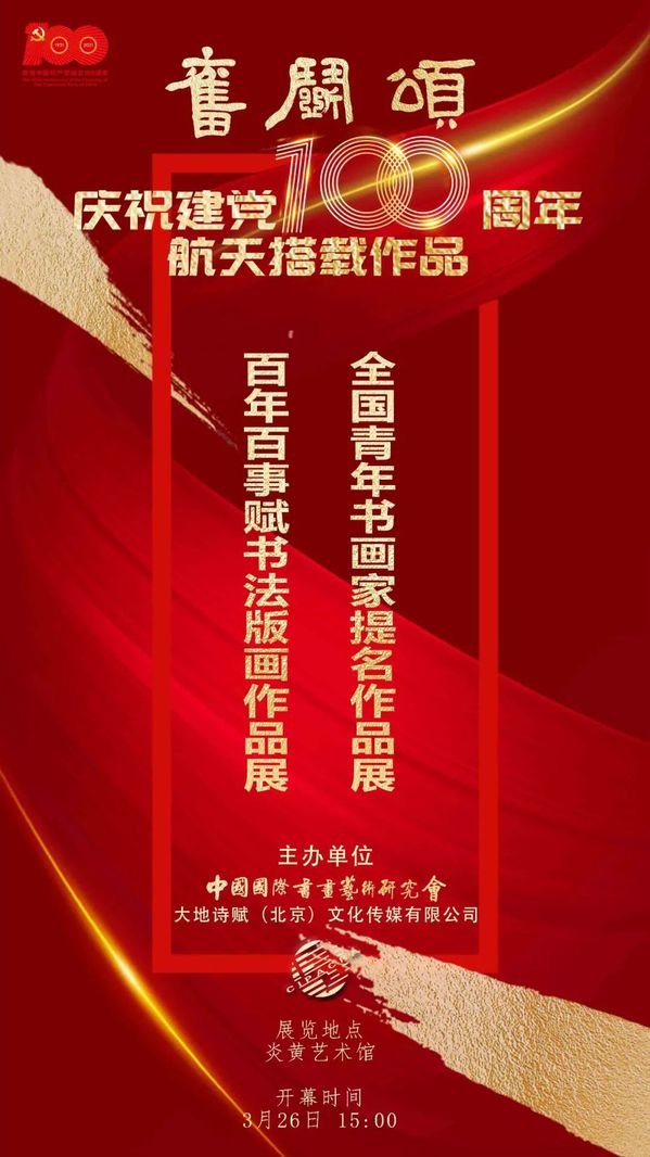 2021年6月,神舟十二號發射,這是中國空間站在軌建造階段的首次載人飛行任務。為慶祝建黨100周年,歌頌黨的百年奮斗歷史和偉大成就,由中國國際書畫藝術研究會、大地詩賦(北京)文化傳媒有限公司等機構共同策劃組織了《奮斗頌》建黨百年書畫藝術大展,100件版畫作品經中國載人航天工程辦公室批準支持,以原作和影像的形式,成功搭載神舟十二號遨游太空,并于2021年9月27日在北京航天城舉行了隆重的開艙交接儀式。這批歌頌黨的百年奮斗歷史、承載著中華民族千百年來飛天之夢、見證了我國載人航天事業高光時刻的書畫賦作品,具有著特殊的歷史意義和審美價值。