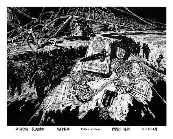 《立國之戰·抗美援朝》從構思到創作完成歷時三個多月,幾易其稿,主要展現新中國成立伊始,這場彪炳史冊、波瀾壯闊的戰爭畫面。畫面中巧妙的運用了鴨綠江斷橋、延綿不絕的志愿軍行軍隊伍和抗美援朝時期的軍功章、記事本等形象元素,并借助黑白木刻的語言特質,使之交錯重迭,畫面氣氛緊張熱烈,寓意深刻,有效烘托出了創作主題。