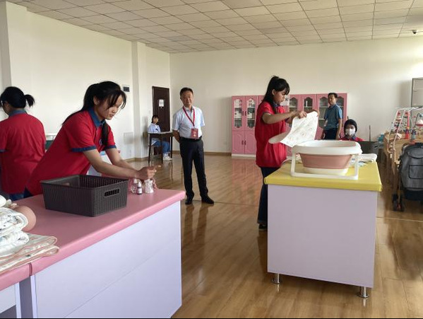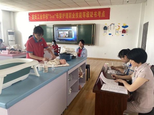 2022年6月11日上午教育部1+X母嬰護理職業技能等級證書考試在安慶專業學校實訓樓舉行。本次考試由教育部認證的第三方機構——山東陽光大姐服務有限公司考評站與工業學校共同負責實施,圓滿完成了 36名學前教育專業在校學生的考證工作??紕瞻才啪挥行?,得到了考評領導和專家的一致好評。