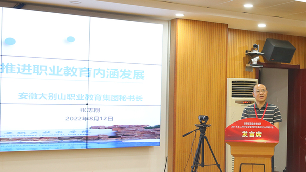 8月12日, 2022年安徽省集團化辦學研討會,在安慶職院行政樓第二會議室舉行。校黨委書記童宏葵致辭,安慶職教集團理事長、校長畢明生主持。