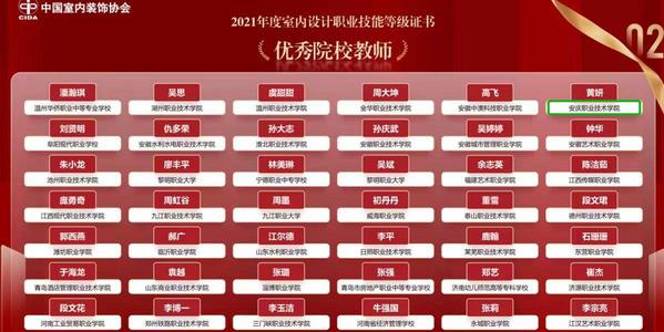 自接到比賽通知后,安慶職院高度重視,積極組建指導老師團隊,選拔參賽學生,制定訓練方案,在比賽過程中,同學們充分發揮自己扎實的專業技能,攻堅克難、沉著應戰,團結協作,最終取得了全國三等獎的好成績。比賽結束后,中國室內裝飾協會對2021年度“1+X(室內設計)”證書試點工作中表現突出的優秀院校代表和教師個人進行了表彰。學校在20212022學年的室內設計“1+X”證書考核中,初級通過率達到96%,中級通過率達到100%,高級通過率達到100%,在此次表彰中獲得2021年度“1+X(室內設計)”證書優秀試點院校,指導老師黃妍獲“優秀院校教師”稱號。