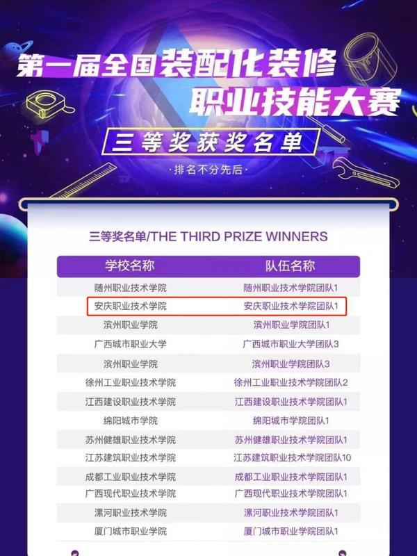 85日,第一屆全國裝配化裝修職業技能大賽——選拔賽如期舉辦,安慶職業技術學院建工學院建筑裝飾工程技術專業王慶成、夏高洋、許曉慧、耿琦偉四名學生參加了大賽,并喜獲全國三等獎。