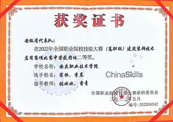 8月27日安慶職業(yè)教育集團(tuán)張歡歡、曹青老師指導(dǎo)翟恒、李晨兩位學(xué)生,在山東城市建設(shè)職業(yè)技術(shù)學(xué)院舉辦的2022年全國職業(yè)院校技能大賽高職組“建筑裝飾技術(shù)應(yīng)用”賽項(xiàng)中喜獲團(tuán)體二等獎(jiǎng)。