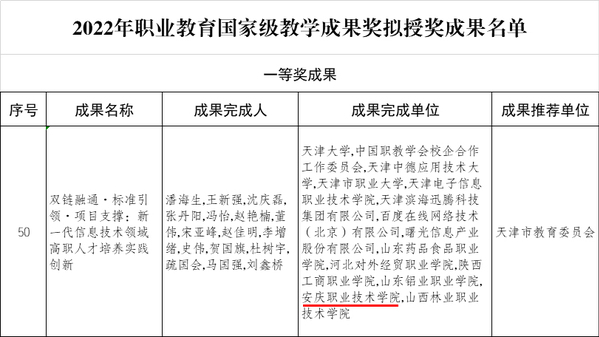 5月15日,教育部就評選出的2022年職業教育國家級教學成果獎擬授獎成果進行公示。安慶職業技術學院參與的“雙鏈融通·體系引領·項目支撐:新一代信息技術領域高職人才培養實踐創新”項目榮獲國家教學成果獎一等獎。該項目由天津大學牽頭,中國職教學會校企合作工作委員會指導,安慶職業技術學院、天津中德應用技術大學、天津市職業大學等九所職業本科和高職院校,天津濱海迅騰科技集團、百度在線網絡技術(北京)有限公司、曙光信息產業股份有限公司等三家企業共同參與,在制度建立、標準制定和創新實踐上進行了深度探索和應用,取得了一系列高質量理論和實踐成果。