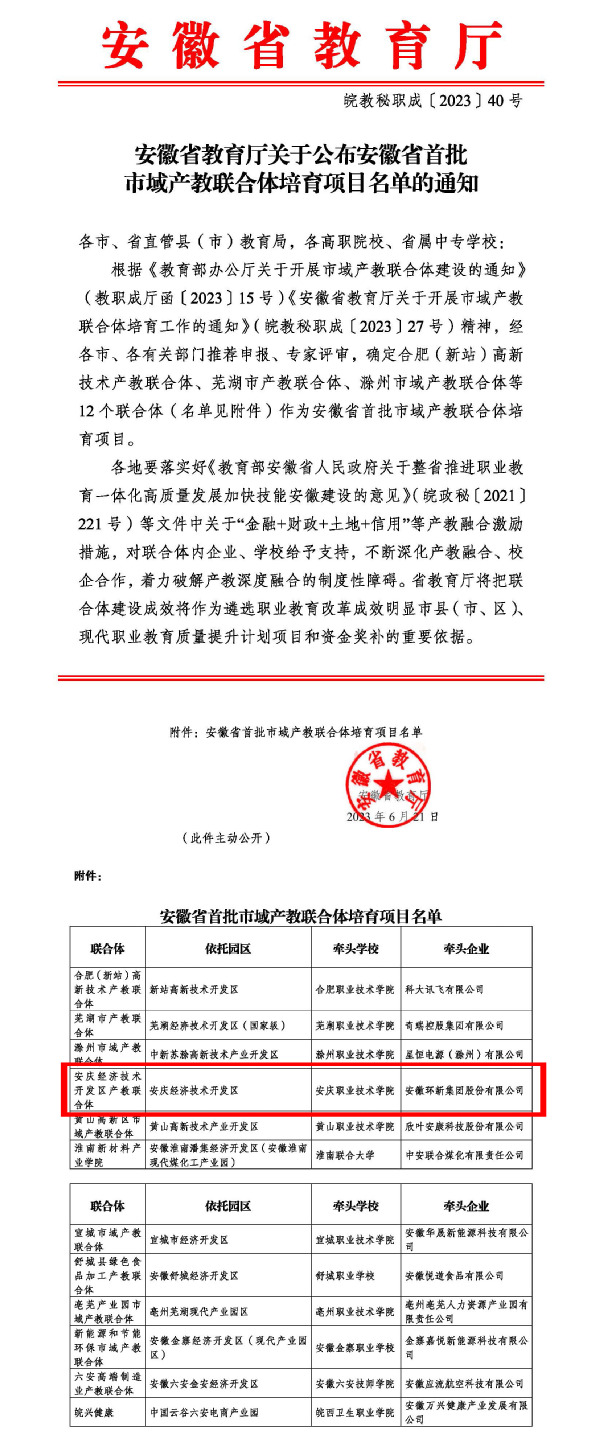 日前,省教育廳公布我省首批市域產教聯合體培育項目名單,由安慶職業技術學院牽頭申報的安慶經濟技術開發區產教聯合體項目以全省第四名成績獲批立項。安慶市域產教聯合體是以安慶經開區為依托,以安慶職業技術學院為牽頭學校,安徽環新集團股份有限公司為牽頭企業,按照“一產一鏈、一園一群”思路組建,將充分發揮產業聚合、企業牽引、學校主體作用,全力推進我市產教深度融合、產學深入合作,積極探索構建政府推動、多部門共同參與、多主體協同、實體化運作的新型產教融合發展模式。