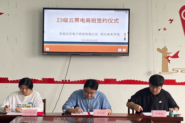 9月25日上午,安慶職業技術學院現代商務學院與安徽云霽電子商務有限公司舉行“23級云霽電商訂單班”簽約儀式。云霽電商公司董事長汪義德、總經理程塞超,現代商務學院黨總支書記、院長金啟勝,副院長余瑰,電子商務專業建設負責人夏金弟及相關輔導員和學生代表等參加簽約儀式。