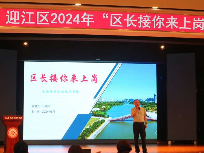 致辭中,畢明生說,連續三年,迎江區區長親自來學校開展“區長接你來上崗”活動,為企業招人才、為學生搭平臺,不僅體現區政府對所轄企業的關心和厚愛,也體現迎江區對安慶職業技術學院莘莘學子的信任和期待,體現迎江區對學校人才培養質量的高度認可。