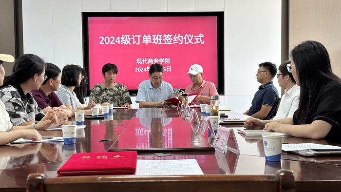 為進一步深化產教融合,助力校企實踐人才培養,促進安慶市數字商務產業學院建設,9月25日,安慶職業技術學院現代商務學院與安徽云霽電子商務有限公司和安慶協成商務服務有限公司舉行產教融合、校企合作交流會暨24級“工學一體”訂單班簽約儀式。云霽電商公司總經理汪義德、協成商務公司總經理楊根蓮及公司相關人員,現代商務學院黨總支書記、院長金啟勝,該院學生工作負責人,電子商務專業負責人、跨境電子商務專業負責人以及相關班級輔導員和學生代表參加簽約儀式,會議及儀式由該院教學工作負責人主持。