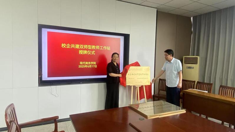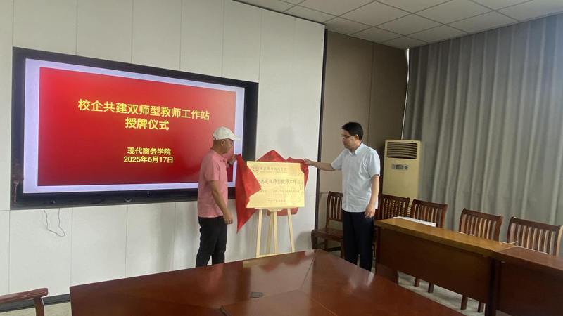 6月17日下午,安慶職業技術學院現代商務學院與安慶協成商務服務有限公司、安徽云霽電子商務有限公司舉行“校企共建雙師型教師工作站”授牌儀式。安慶協成商務服務有限公司總經理楊根蓮,安徽云霽電子商務有限公司總經理汪義德,現代商務學院院長金啟勝,教學管理工作和學生工作負責人參加儀式并進行座談。
