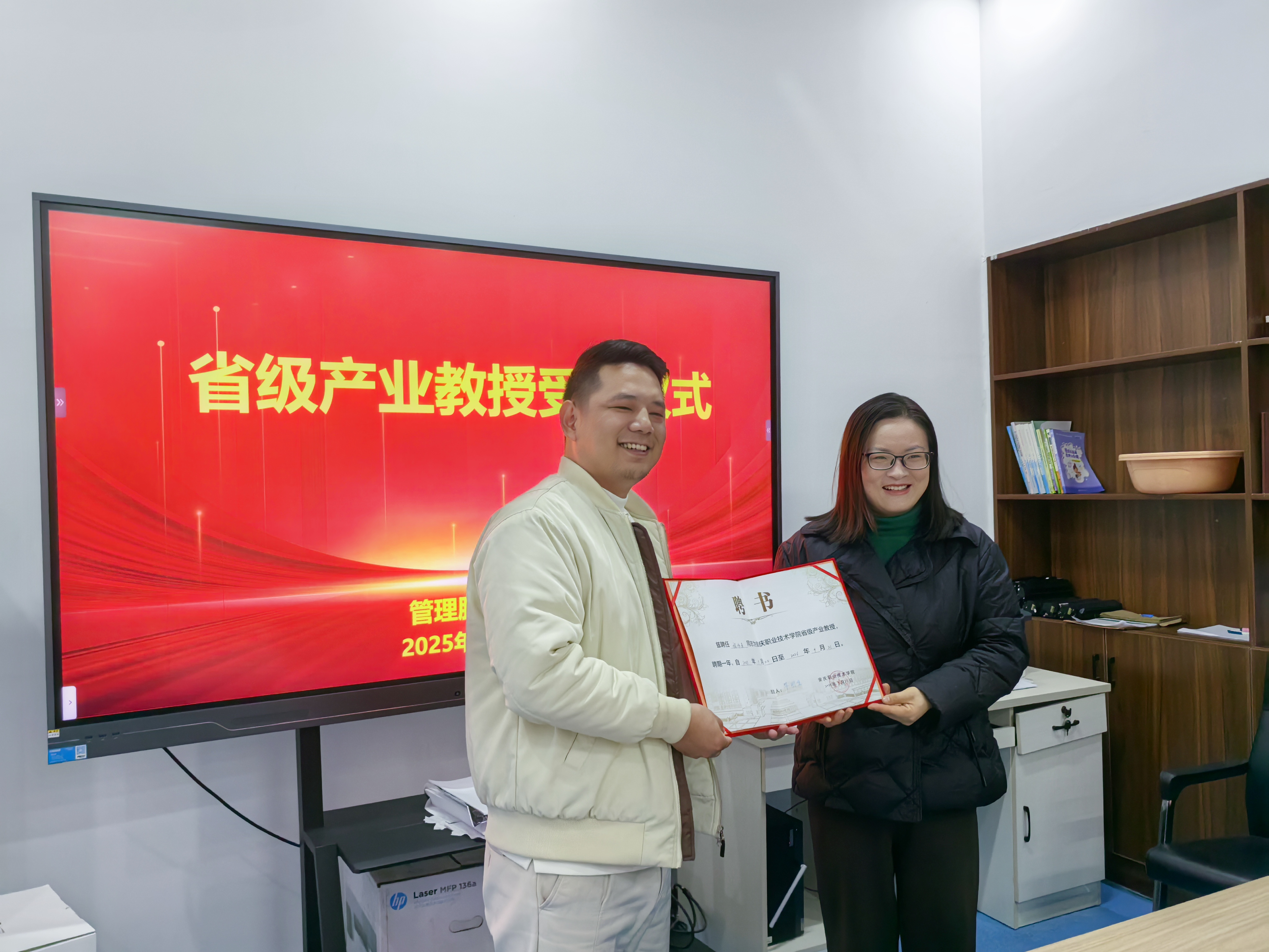 12月19日,安慶職業技術學院管理服務學院在幼兒三期會議室舉行省級產業教授聘任儀式,聘請安徽云驢通信息技術有限公司總經理程偉勇為該院產業教授。該院院長陳穎為程偉勇頒發聘書,該院教學工作負責人主持儀式,相關工作人員,旅游管理和酒店管理與數字化運營教學團隊教師代表、安徽云驢通信息技術有限公司代表參加了儀式。